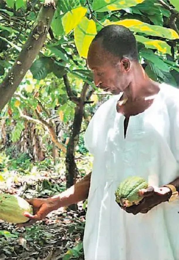 A peasant is checking the growth of cocoa on a cocoa plantation in Ghana’s Eastern Region. (Photo/Xinhua News Agency)