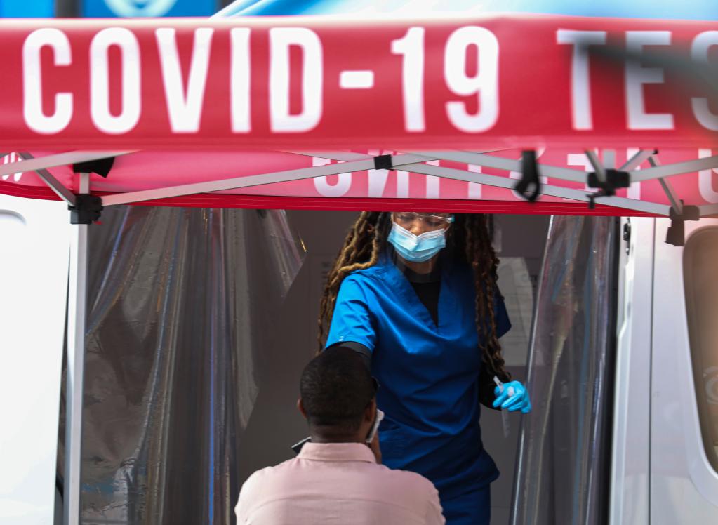 A medical worker collects a swab sample from a man at a COVID-19 testing site on Times Square in New York, the United States, May 17, 2022. (Xinhua/Wang Ying)