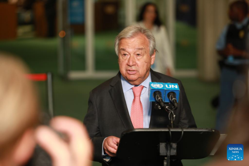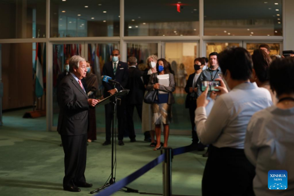 UN Secretary-General Antonio Guterres (L, Front) speaks to the press at the UN headquarters in New York, on Aug. 1, 2022. Guterres on Monday welcomed the first commercial vessel sailing from Ukraine's Odesa under the Black Sea Grain Initiative brokered by the United Nations and Trkiye. (Xinhua/Xie E)