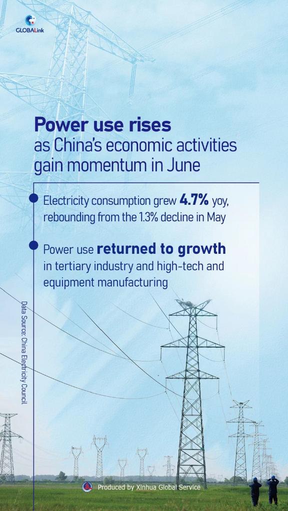 In June alone, power consumption was recorded at 745.1 billion kilowatt-hours, an increase of 4.7 percent from a year ago. The growth rate was 6 percentage points higher than that in May when the country was hit by sporadic resurgences of COVID-19.