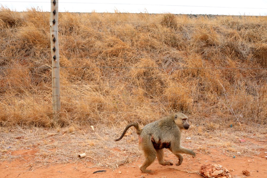 Photo taken on July 28, 2022 shows two baboons near a fence next to the Mombasa-Nairobi railway track in Nairobi, Kenya. (Xinhua/Dong Jianghui)
