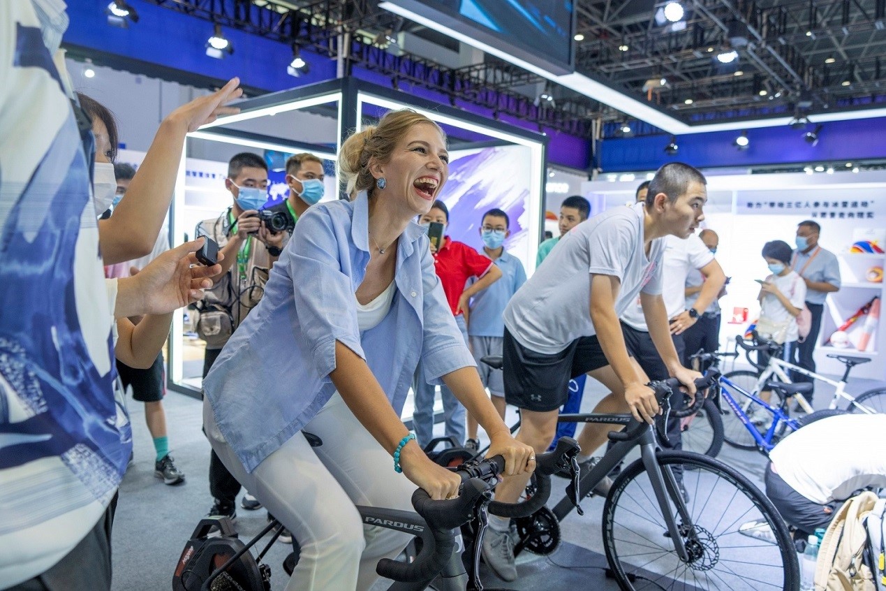 Visitors experience cycling at the second China International Consumer Products Exp, July 28, 2022. (People's Daily Online/Yuan Chen)