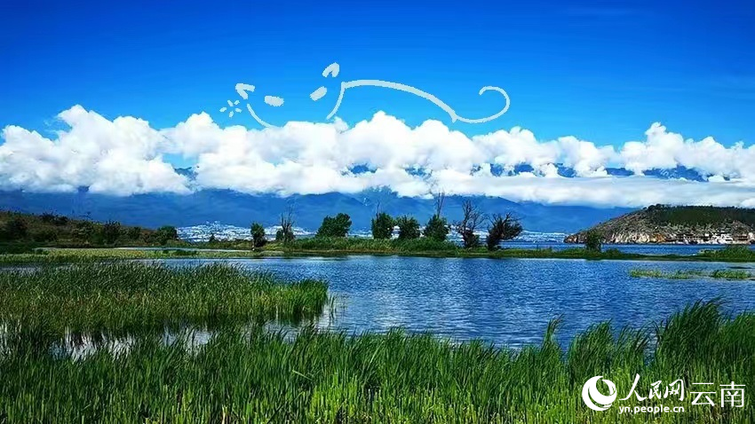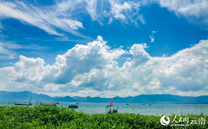 Photo shows clouds above Fuxian Lake in Yuxi city, southwest China’s Yunnan Province. (Photo taken by Liu Yi of People’s Daily Online; image in the same photo drawn by Li Xiaoran)