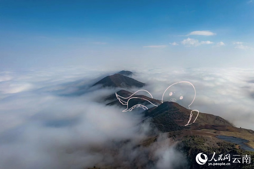 Photo shows clouds in the sky at Daheishan Mountain in Kaiyuan city of Honghe Hani and Yi Autonomous Prefecture in southwest China’s Yunnan Province. (Photo taken by Li Lei; image in the same photo drawn by Li Xiaoran)