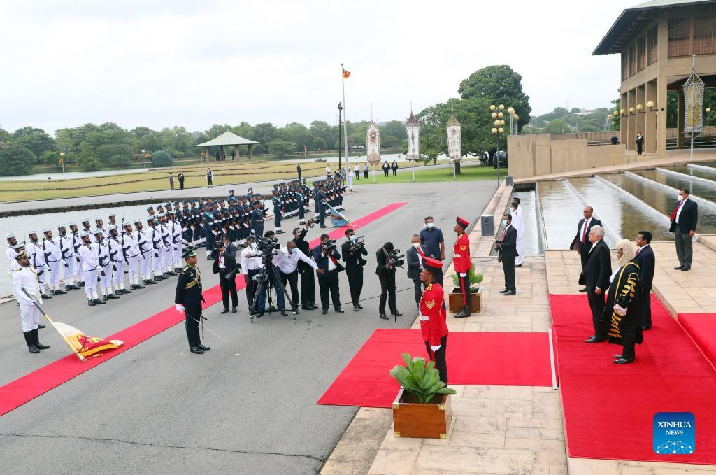 Sri Lankan President Ranil Wickremesinghe receives the guard of honor for the ceremonial opening of the third session of the 9th Parliament in Sri Jayawardenepura Kotte, Sri Lanka, Aug. 3, 2022. Sri Lankan President Ranil Wickremesinghe on Wednesday urged political parties to join him in establishing an all-party government that can lead Sri Lanka out of the economic crisis. In delivering the government's policy statement following the ceremonial opening of the third session of the 9th Parliament, Wickremesinghe said that he has already started discussions with political parties on the matter. (Photo by Ajith Perera/Xinhua)