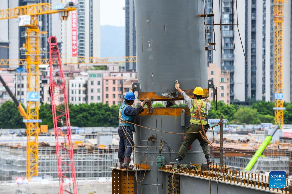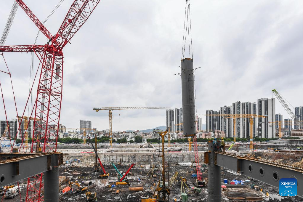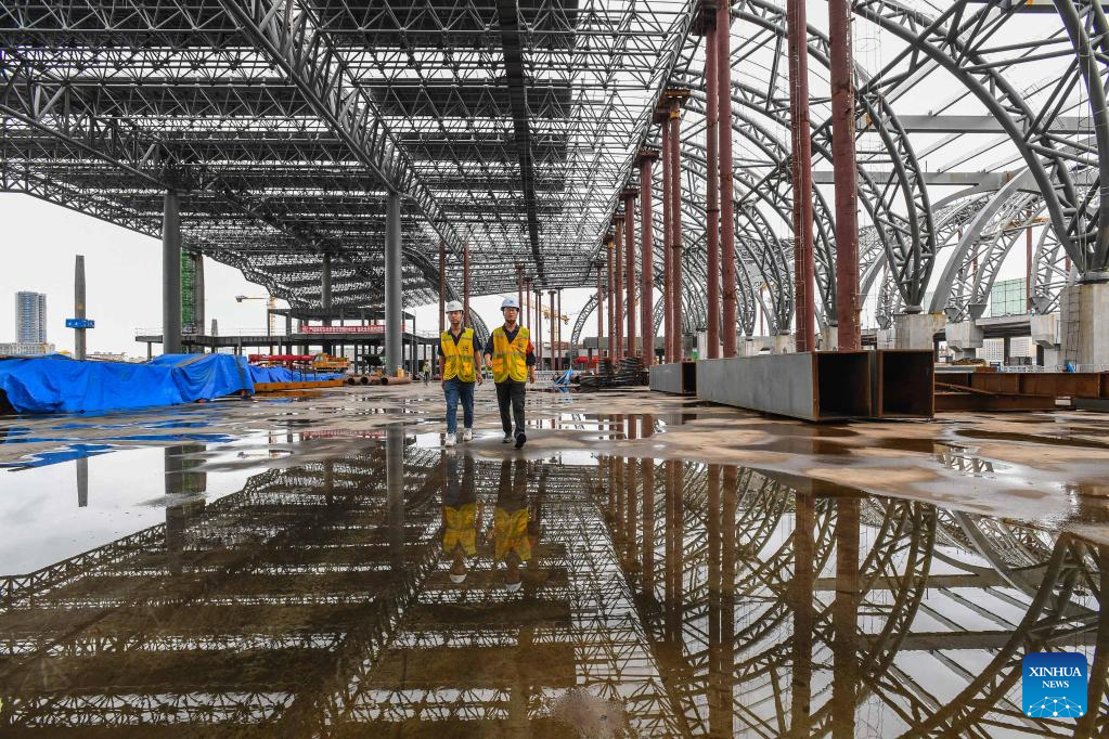 Workers work at the construction site of Guangzhou Baiyun Railway Station in Guangzhou, south China's Guangdong Province, Aug. 4, 2022. The main structure in phase one of the construction has been accomplished. (Xinhua/Liu Dawei)