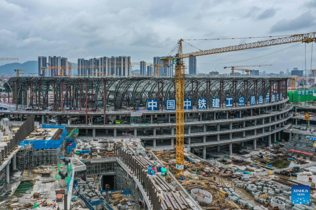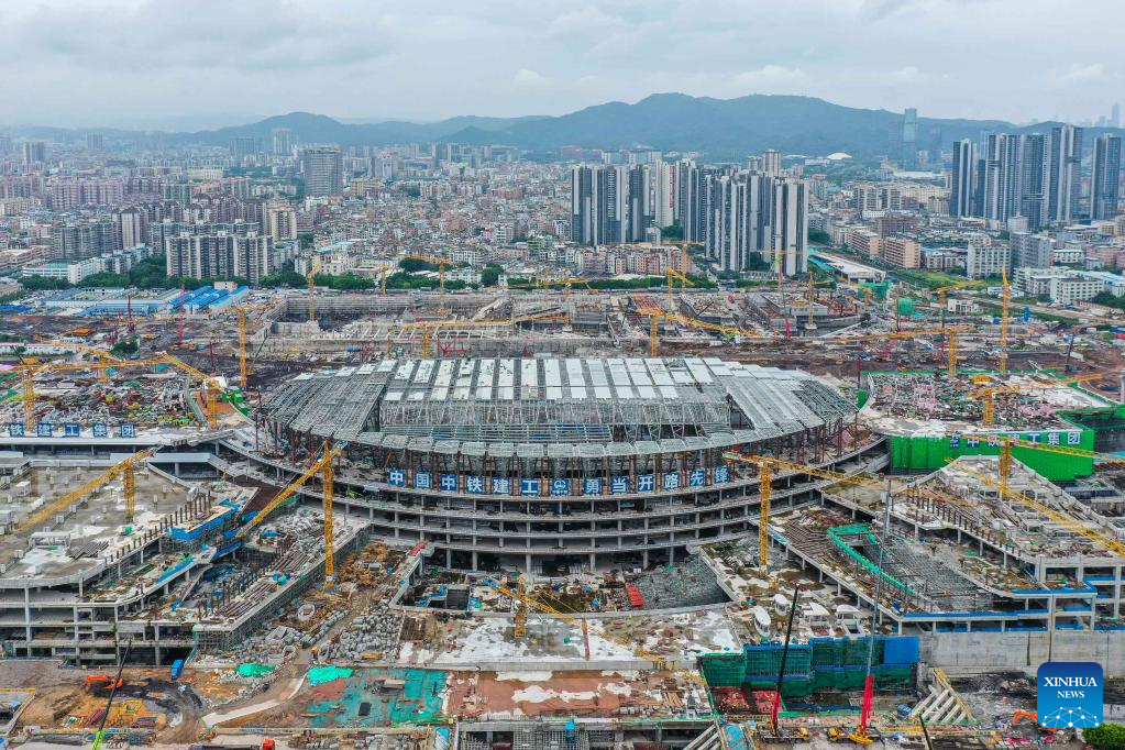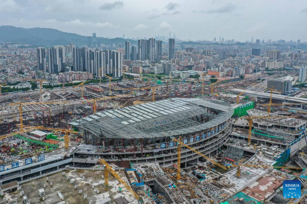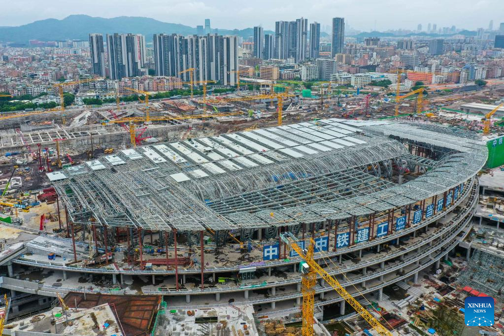 Photo taken on Aug. 4, 2022 shows the construction site of Guangzhou Baiyun Railway Station in Guangzhou, south China's Guangdong Province. The main structure in phase one of the construction has been accomplished. (Xinhua/Liu Dawei)