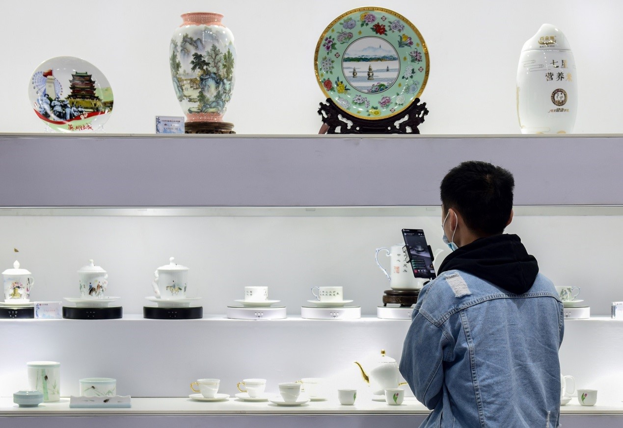 The China Jingdezhen International Ceramic Fair is held in Jingdezhen, east China's Jiangxi province, October 2020. Photo shows an employee of an e-commerce company hosting a livestream show at the event. (People's Daily/Hu Dunhuang)