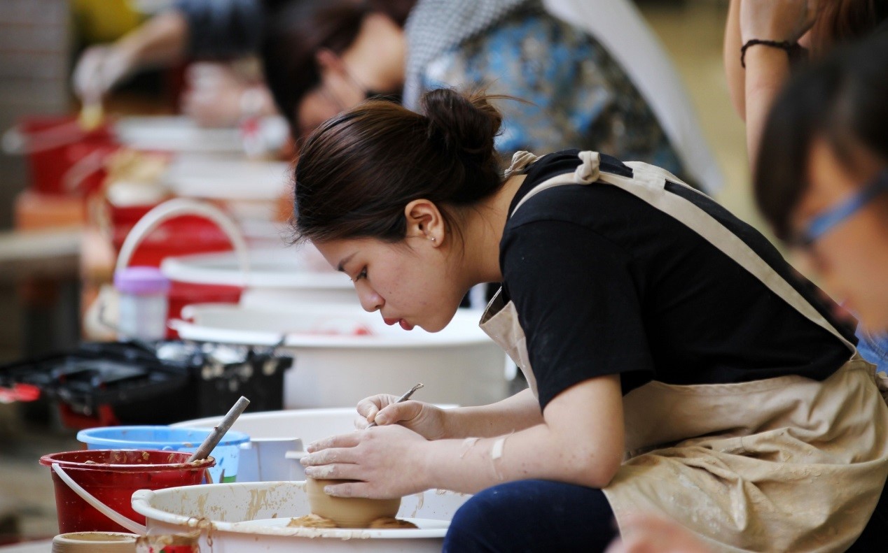 A student learns pottery making at the Xianghu campus of Jingdezhen Ceramic University, east China's Jiangxi province. (People's Daily Online/Xu Zheng)