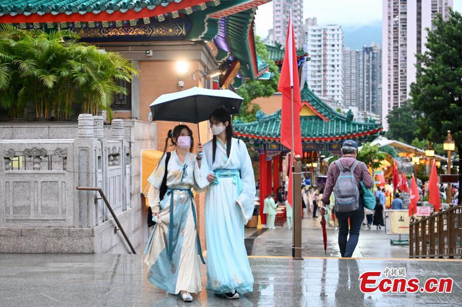 Young women wearing traditional Chinese costumes celebrate Qixi festival, the Chinese Valentine's Day at Wong Tai Sin Temple in the Hong Kong Special Administrative Region, Aug. 4, 2022. (Photo: China News Service/Li Zhihua)