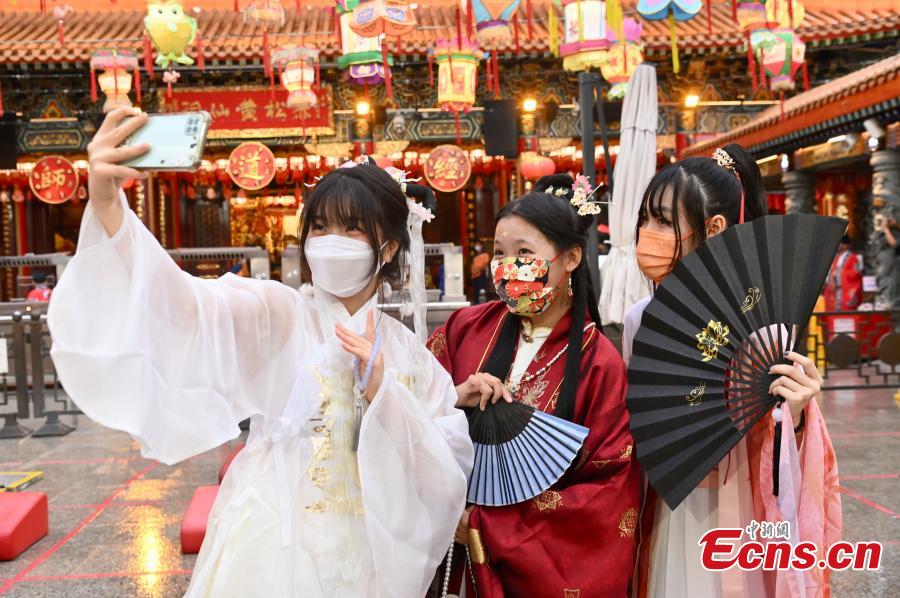 Young women wearing traditional Chinese costumes pose for photos during a celebration for Qixi festival, the Chinese Valentine's Day, at Wong Tai Sin Temple in the Hong Kong Special Administrative Region, Aug. 4, 2022. (Photo: China News Service/Li Zhihua)