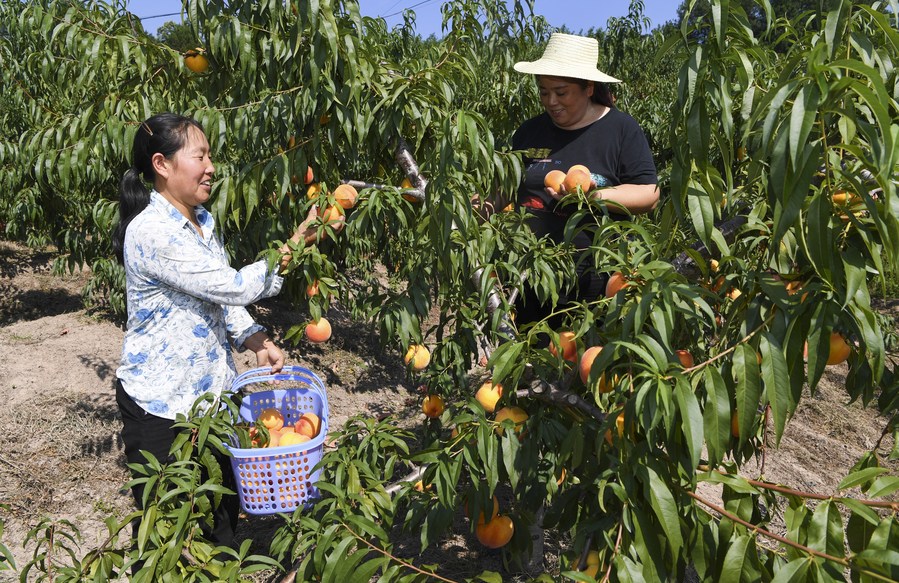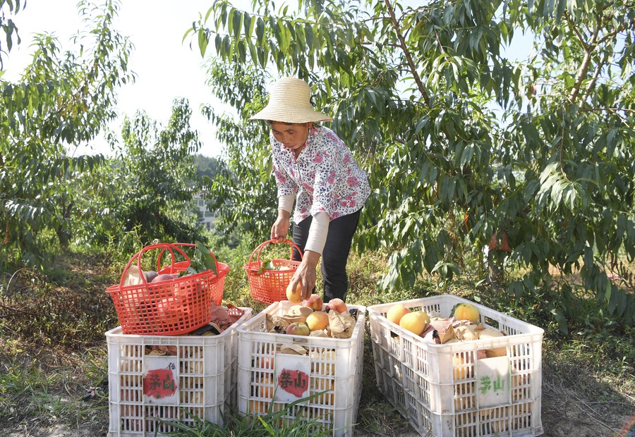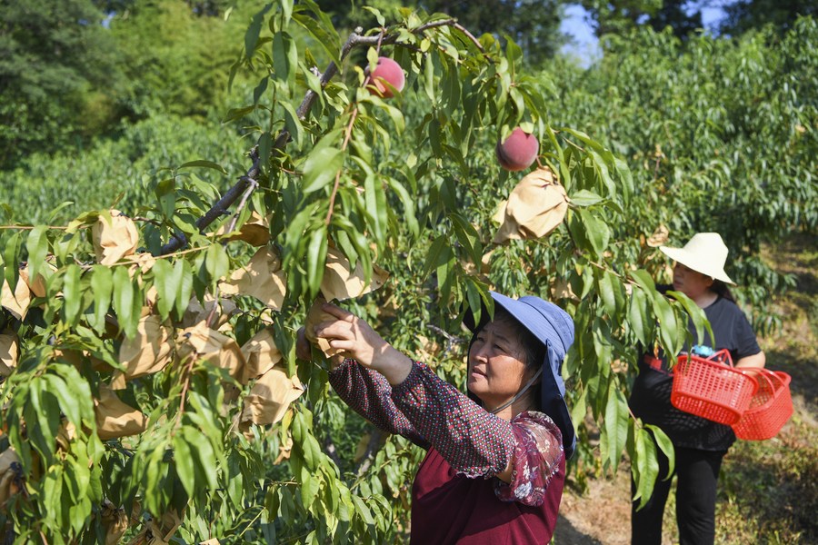 Villagers harvest peaches in Hongfeng Village of Henghe Tujia Township in Wanzhou District, southwest China's Chongqing, Aug. 3, 2022. (Xinhua/Wang Quanchao)
