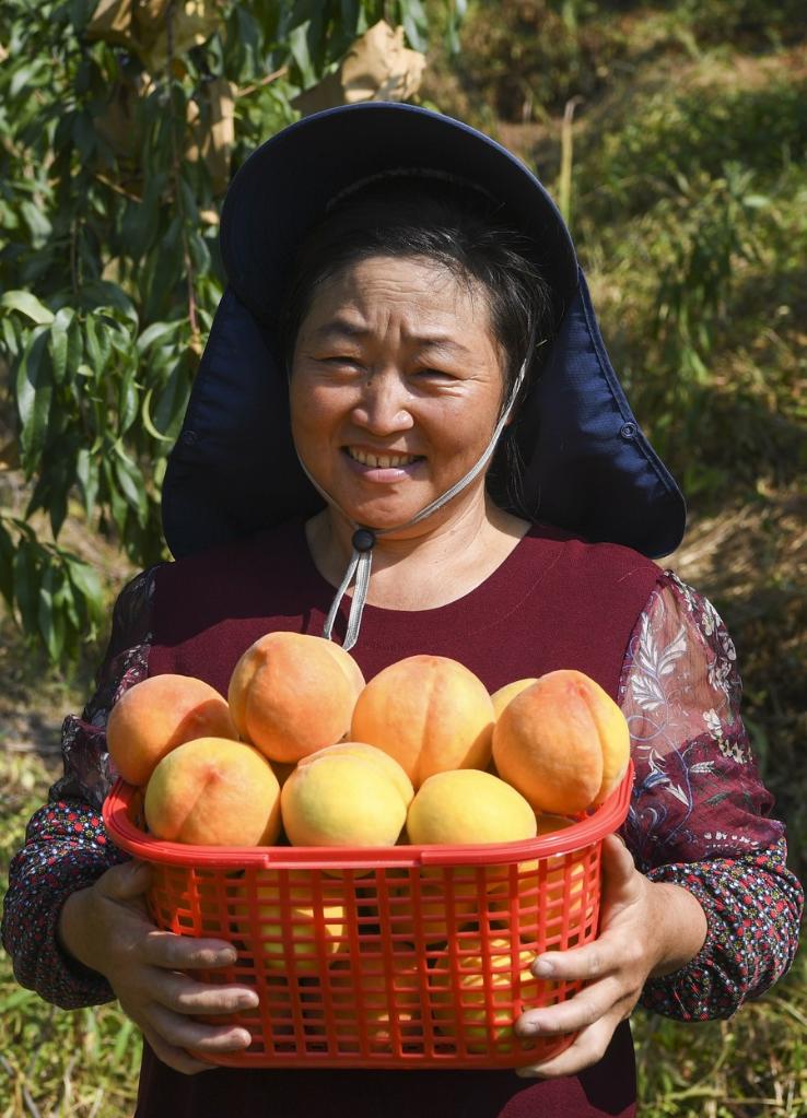 A villager shows newly-harvested peaches in Hongfeng Village of Henghe Tujia Township in Wanzhou District, southwest China's Chongqing, Aug. 3, 2022. (Xinhua/Wang Quanchao)