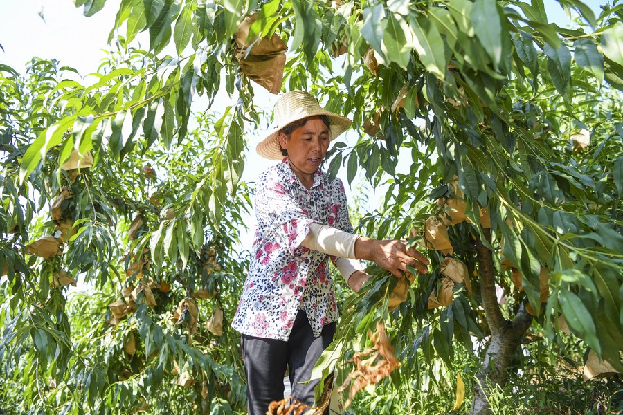 A villager harvests peaches in Hongfeng Village of Henghe Tujia Township in Wanzhou District, southwest China's Chongqing, Aug. 3, 2022. (Xinhua/Wang Quanchao)