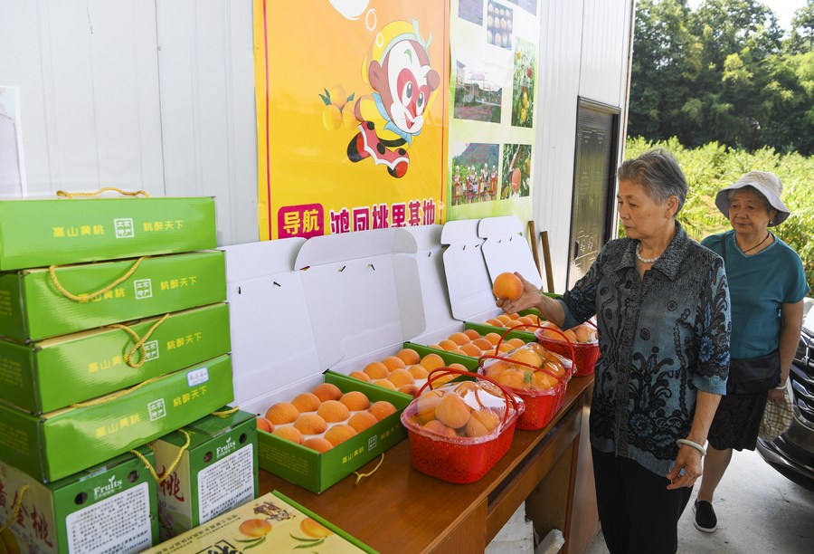 Tourists purchase peaches in Hongfeng Village of Henghe Tujia Township in Wanzhou District, southwest China's Chongqing, Aug. 3, 2022. (Xinhua/Wang Quanchao)