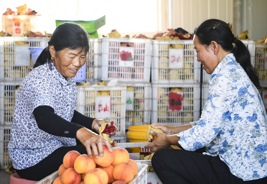 Villagers sort peaches in Hongfeng Village of Henghe Tujia Township in Wanzhou District, southwest China's Chongqing, Aug. 3, 2022. (Xinhua/Wang Quanchao)
