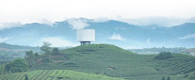 Such works include a special mirror inspired by a traditional tool used to grind tea leaves, "containers of memories" made up of jars of pickled vegetables and grain buckets collected from local families, as well as a giant bird's nest, a "ladder to the sky," and a huge "lamp" inside a tea garden.