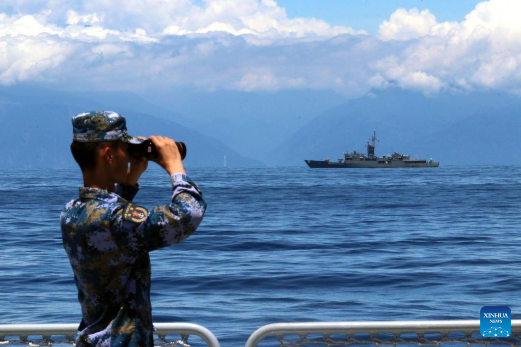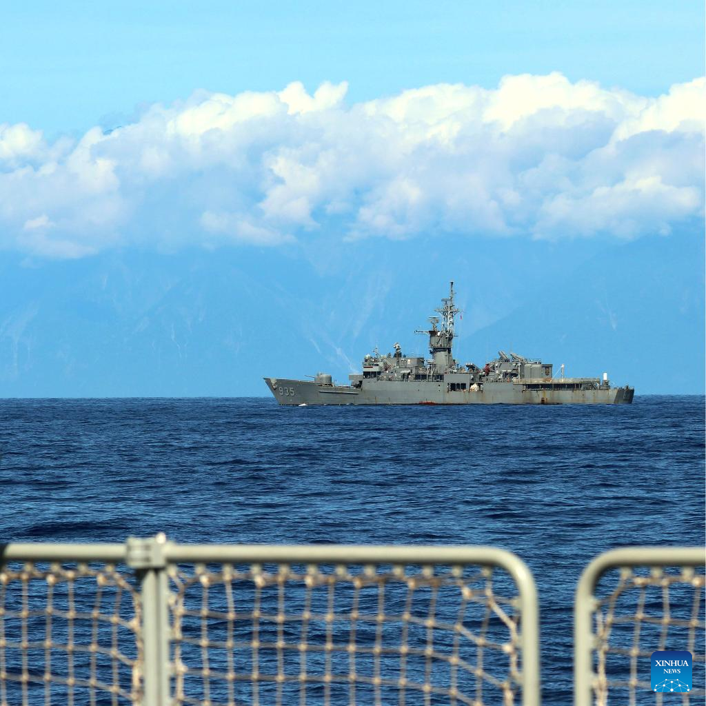 Photo taken on Aug. 5, 2022 shows a Taiwan military vessel as seen from a warship of the navy of the Eastern Theater Command of the Chinese People's Liberation Army (PLA) during the navy's combat exercises and training in the waters around the Taiwan Island. The Eastern Theater Command on Friday continued joint combat exercises and training in the waters and airspace around the Taiwan Island. (Photo by Lin Jian/Xinhua)