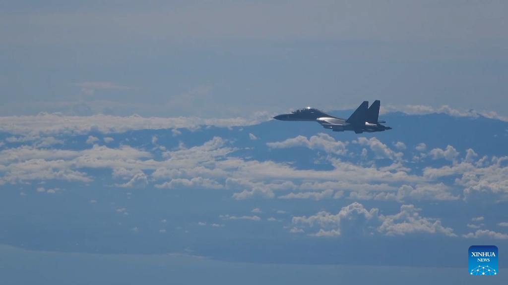 A video screenshot shows a warplane conducting operations during exercises and training of the air force corps of the Eastern Theater Command of the Chinese People's Liberation Army (PLA) around the Taiwan Island, Aug. 5, 2022. The Eastern Theater Command on Friday continued joint combat exercises and training in the waters and airspace around the Taiwan Island. (Xinhua)