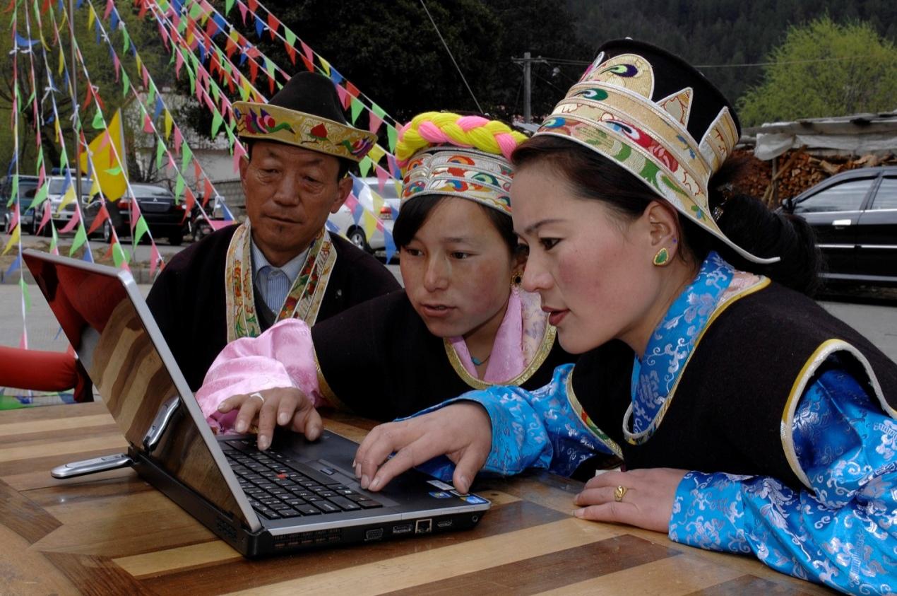 Residents from a village in Nyingchi, southwest China's Tibet autonomous region browse news on the internet during an activity aiming to introduce broadband services to Tibetan villages, April 10, 2012. (Photo by Li Weiming/People's Daily Online)
