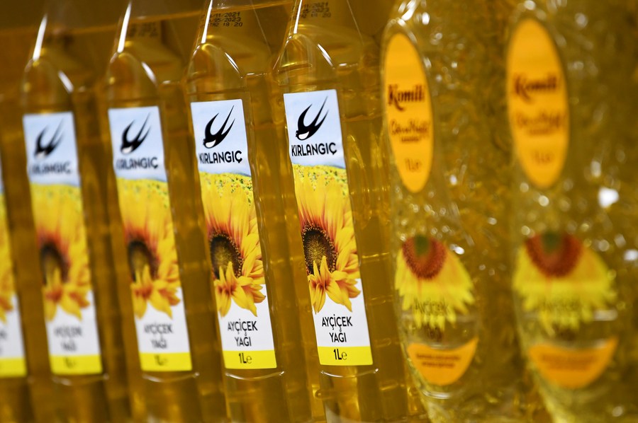 Photo taken on March 7, 2022 shows bottles of sunflower oil for sale at a supermarket in Istanbul, Turkey. (Xinhua/Shadati)