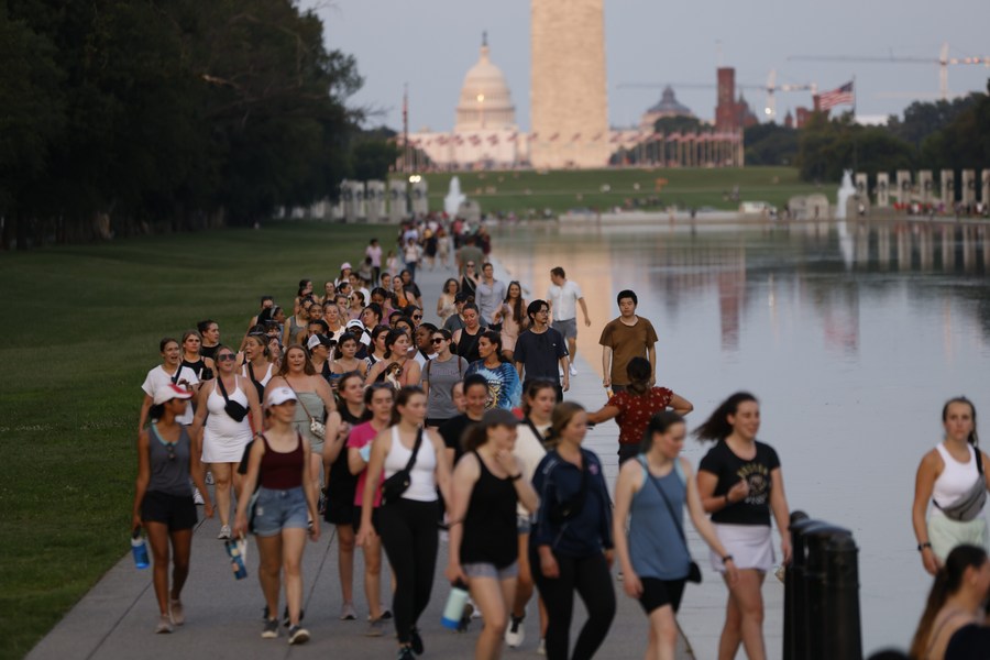 Tourists walk on the National Mall in Washington, D.C., the United States, on July 24, 2022. (Photo by Aaron Schwartz/Xinhua)