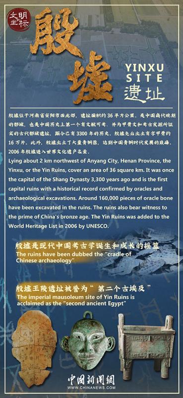 Lying about 2km northwest of Anyang City, Henan Province, the Yinxu, or the Yin Ruins, cover an area of 36 square km. It was once the capital of the Shang Dynasty, 3300 years ago and is the first capital ruins with a historical record confirmed by oracles and archaeological excavations. Around 160,000 pieces of oracle bone have been excavated in the ruins. The ruins also bear witness to the prime of China's bronze age. The Yin Ruins was added to World Heritage List in 2006 by UNESCO.