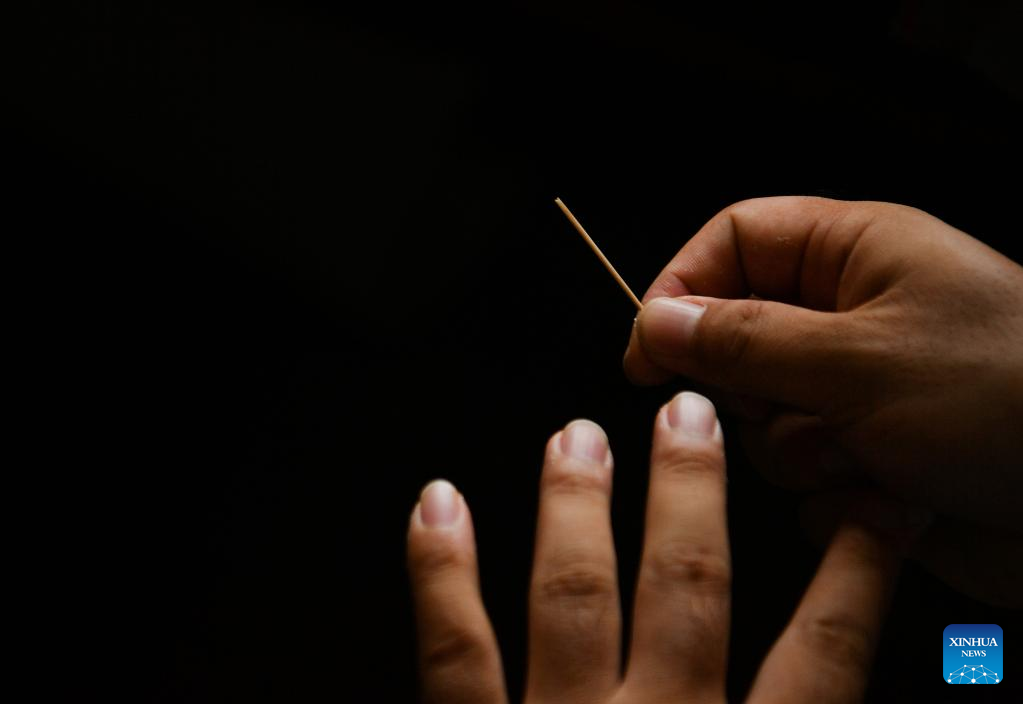 An archeologist shows a needle made of bone excavated from the Shimao ruins, an important prehistoric site in Shenmu City, northwest China's Shaanxi Province, Aug. 6, 2022.