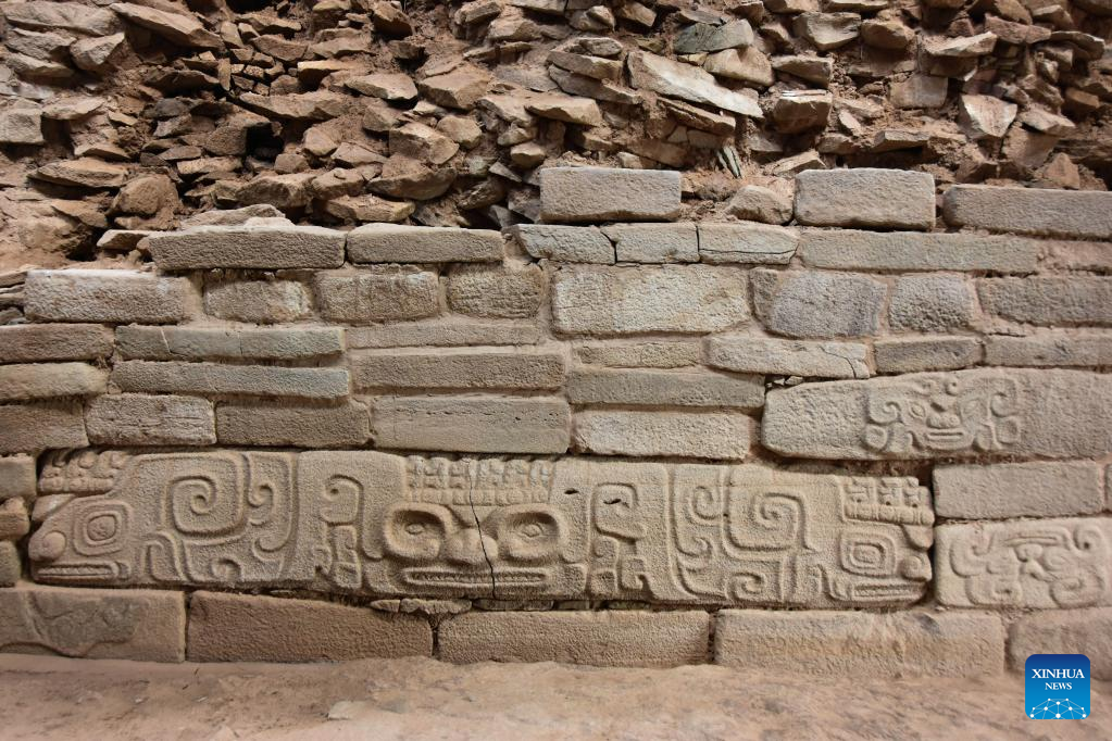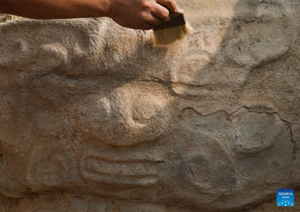 Photo taken on Aug. 6, 2022 shows stone carvings excavated from the Shimao ruins, an important prehistoric site in Shenmu City, northwest China's Shaanxi Province.