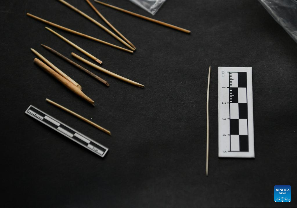 Photo taken on Aug. 6, 2022 shows needles made of bone excavated from the Shimao ruins, an important prehistoric site in Shenmu City, northwest China's Shaanxi Province.