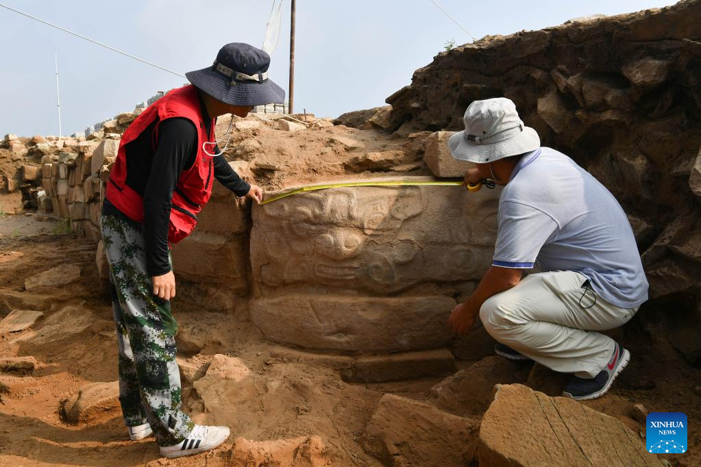 Archeologists measure a recently-excavated stone carvings at the Shimao ruins, an important prehistoric site in Shenmu City, northwest China's Shaanxi Province, Aug. 6, 2022.