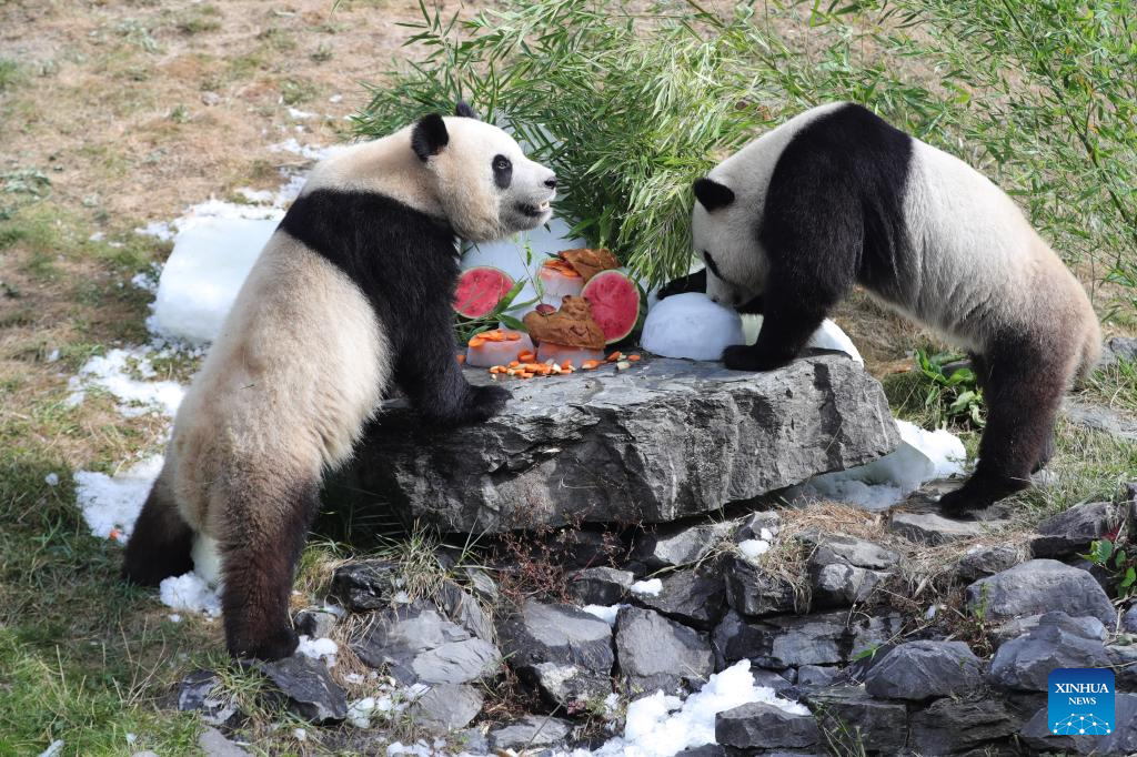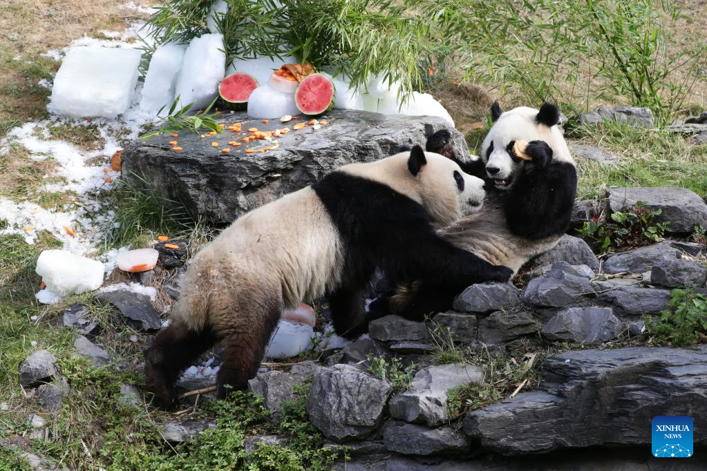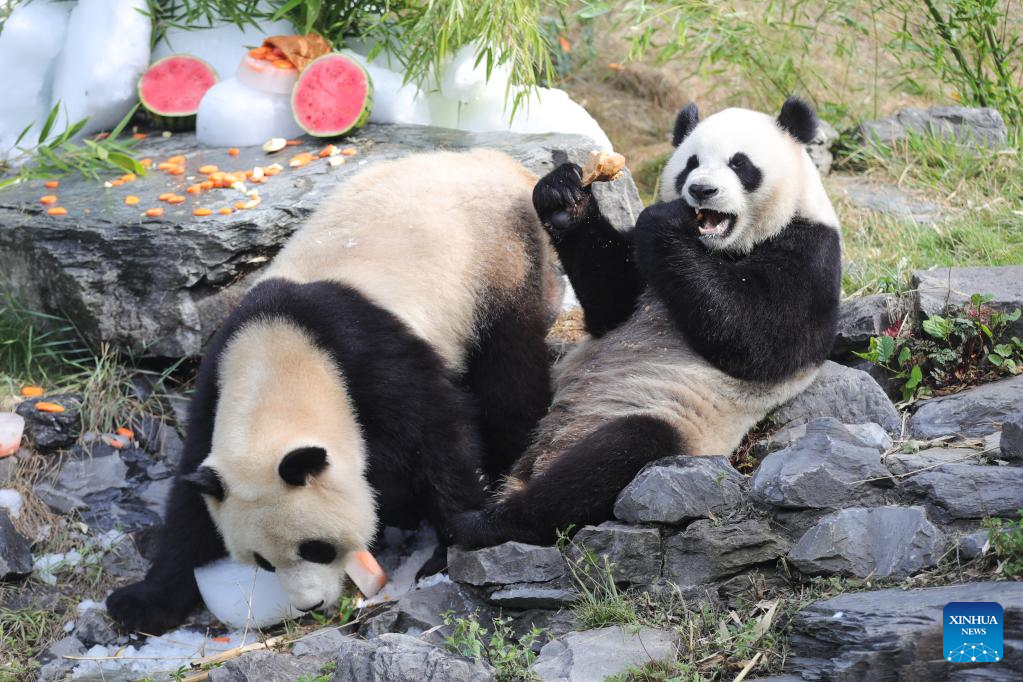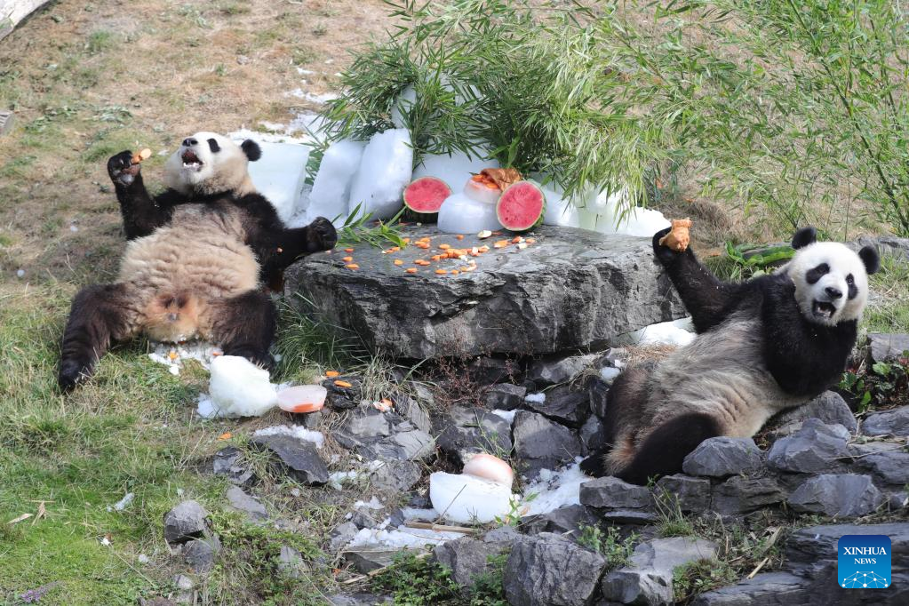Giant panda twins "Bao Di" (R) and "Bao Mei" have birthday meal at the Pairi Daiza zoo in Brugelette, Belgium, Aug. 6, 2022. The celebration of the third birthday of the panda twins Bao Di and Bao Mei, born on Aug. 8, 2019 to Hao Hao and Xing Hui, was held at the Pairi Daiza zoo on Saturday. (Xinhua/Zheng Huansong)