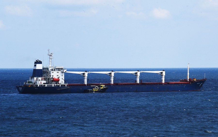 The first grain-laden ship leaving Ukraine receives inspection by a team of representatives from the Joint Coordination Center (JCC) on the northwestern entrance of the Bosphorus Strait in Istanbul, Türkiye, Aug. 3, 2022. (Xinhua/Shadati)