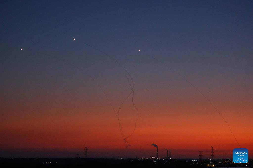 Streaks of smoke are seen as Israel's Iron Dome defense system intercepts rockets launched from the Gaza Strip, as seen from Ashkelon, southern Israel, on Aug. 7, 2022. Israel confirmed on Sunday it has agreed an Egyptian-brokered cease-fire with the Palestinian Islamic Jihad (PIJ) in the Gaza Strip, ending the deadly Israeli airstrikes and the barrage of Palestinian rockets for three days. (Ilan Assayag/JINI via Xinhua)