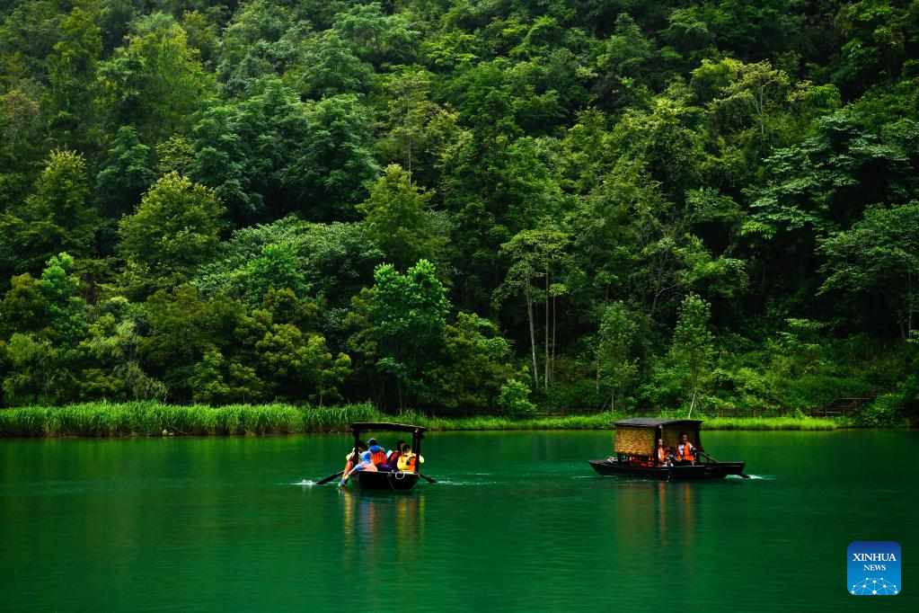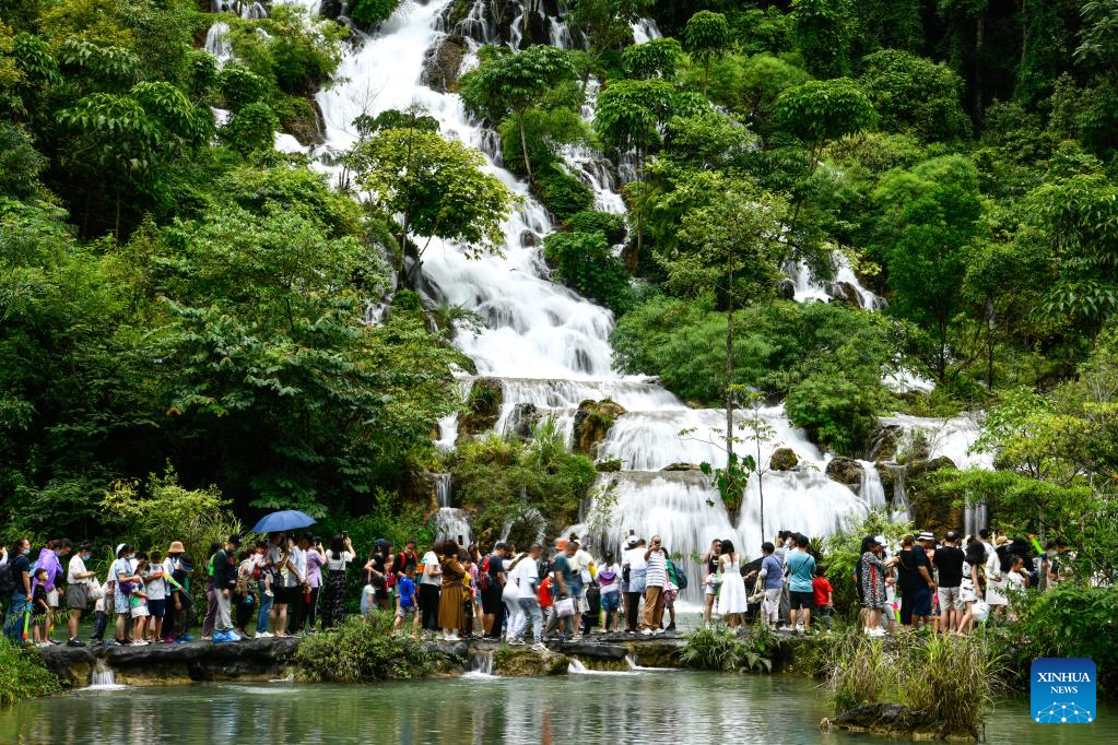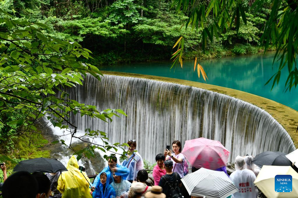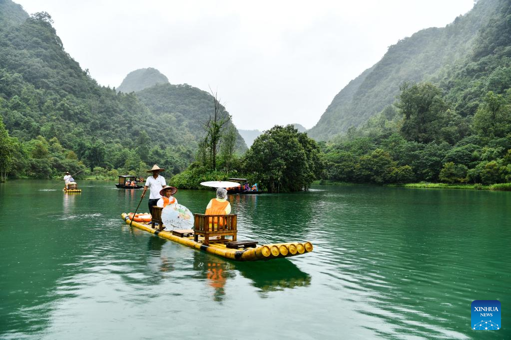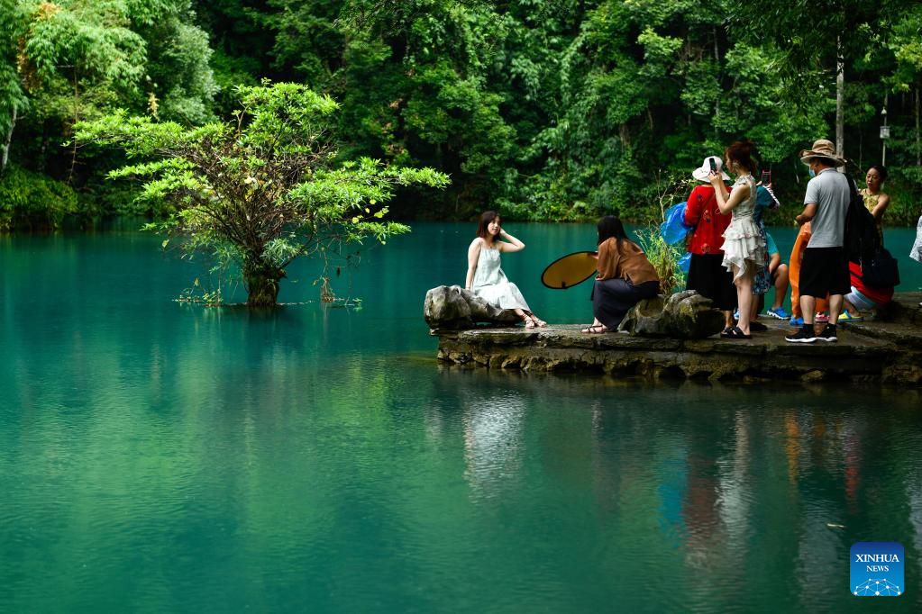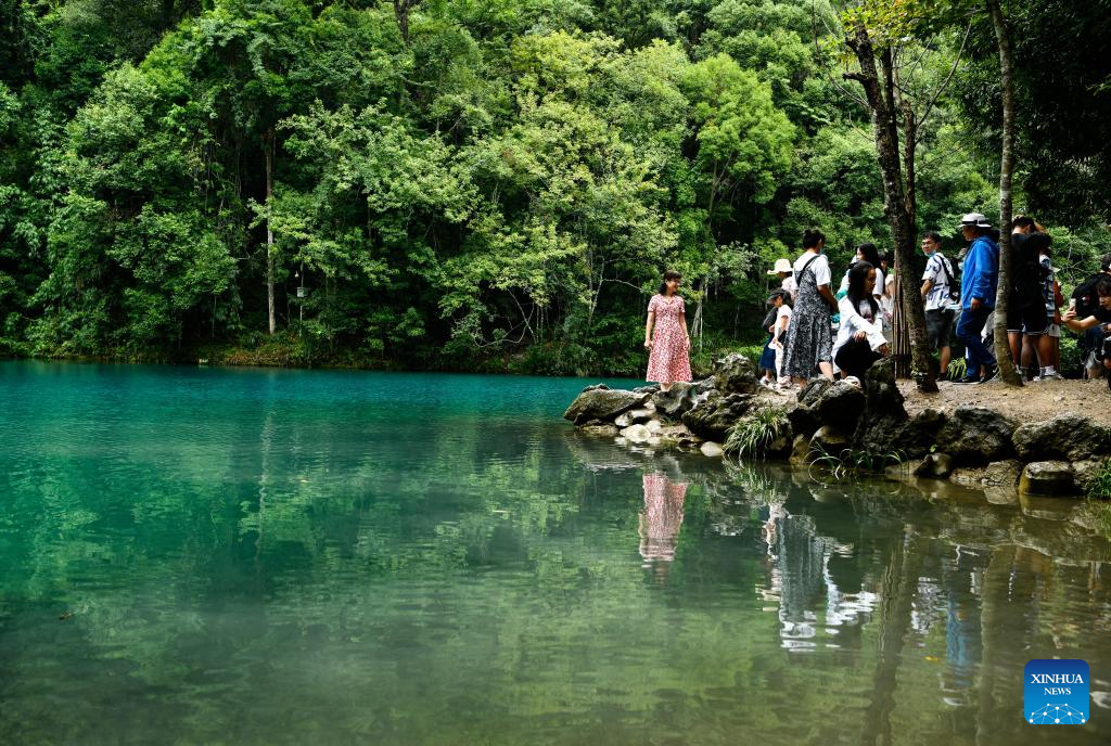 Tourists visit Xiaoqikong scenic spot in Libo County, southwest China's Guizhou Province, Aug. 6, 2022. The county has been promoting tourism consumption under COVID-19 prevention and control measures. (Xinhua/Yang Wenbin)