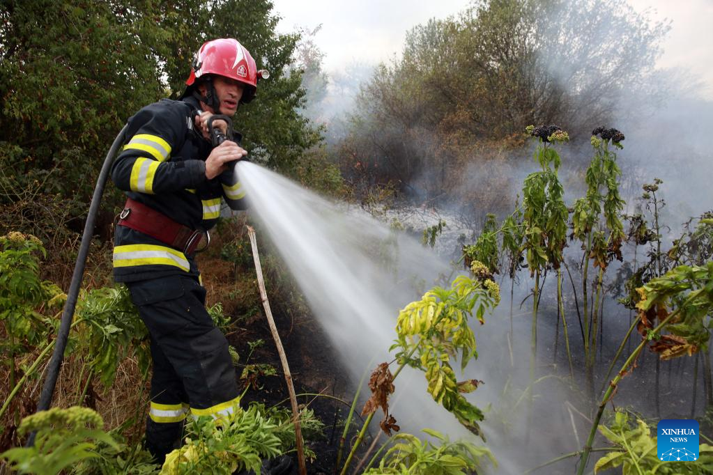 A firefighter puts out vegetation fire started by high temperature on a field in Teleorman County, Romania, on Aug. 7, 2022. Romania is facing severe drought this summer. (Photo by Gabriel Petrescu/Xinhua)