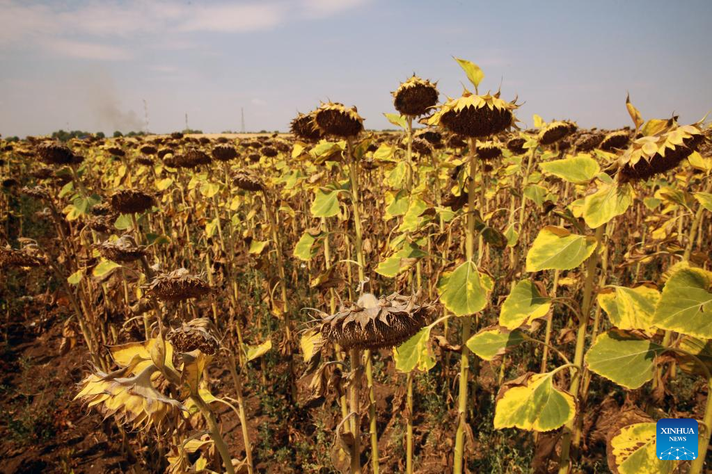 A sunflower field is affected by drought in Teleorman County, Romania, on Aug. 7, 2022. Romania is facing severe drought this summer. (Photo by Gabriel Petrescu/Xinhua)