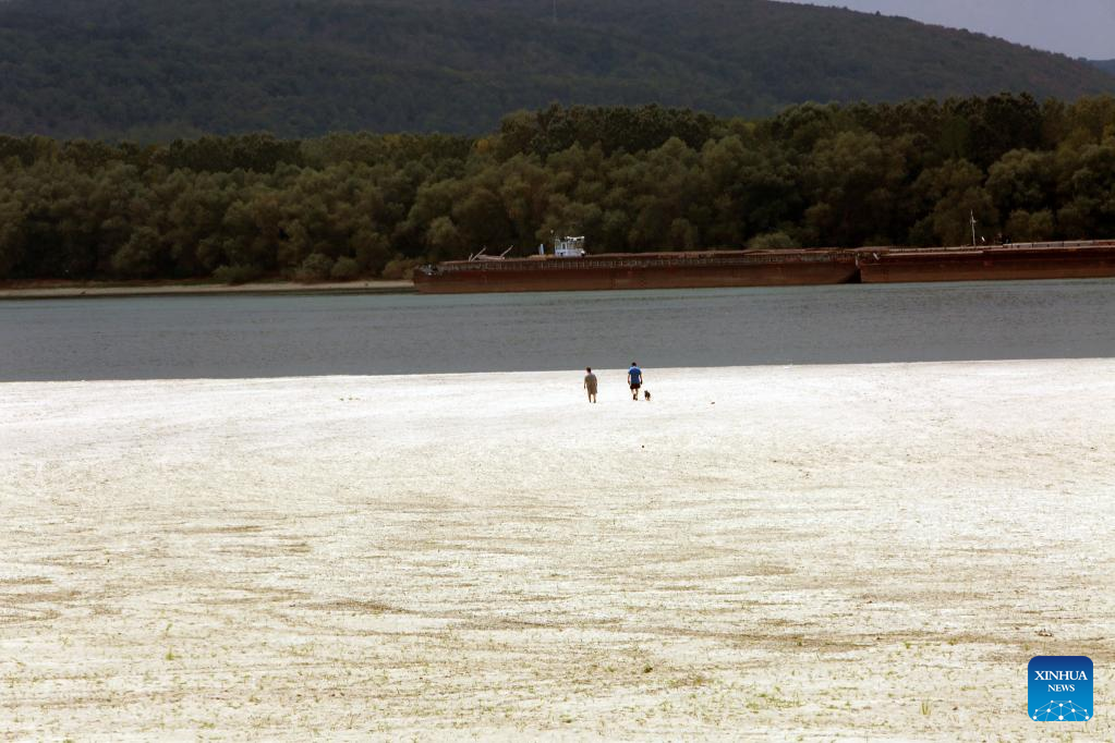 People walk on the dry bed of Danube River in Teleorman County, Romania, Aug. 7, 2022. Romania is facing severe drought this summer. (Photo by Gabriel Petrescu/Xinhua)