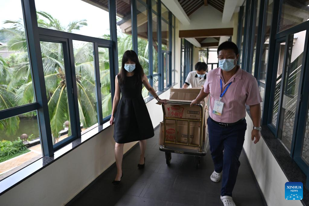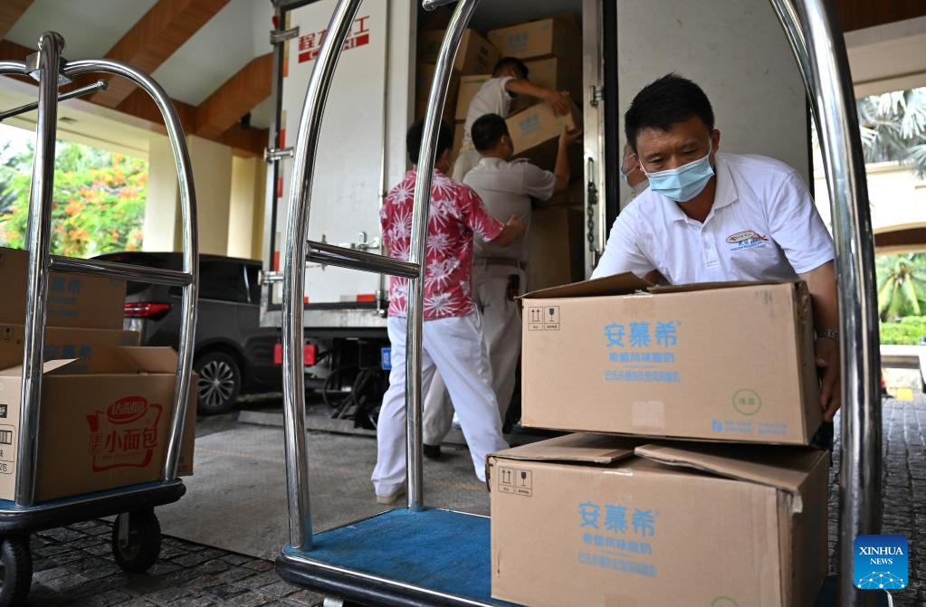 Staff members move daily life supplies at a hotel in Yalong Bay, Sanya, south China's Hainan Province, Aug. 8, 2022. Task forces have been established to work around the clock to ensure daily life supplies for local residents and stranded tourists in an effort to fight against the new resurgence of COVID-19 in the city. (Xinhua/Guo Cheng)