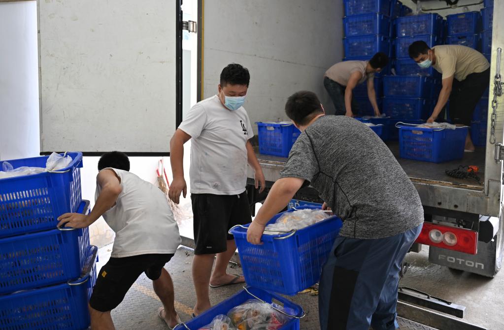 Staff members load daily life supplies to a vehicle before delivery to local hotels where stranded tourists stay, in Sanya, south China's Hainan Province, Aug. 8, 2022. Task forces have been established to work around the clock to ensure daily life supplies for local residents and stranded tourists in an effort to fight against the new resurgence of COVID-19 in the city. (Xinhua/Guo Cheng)