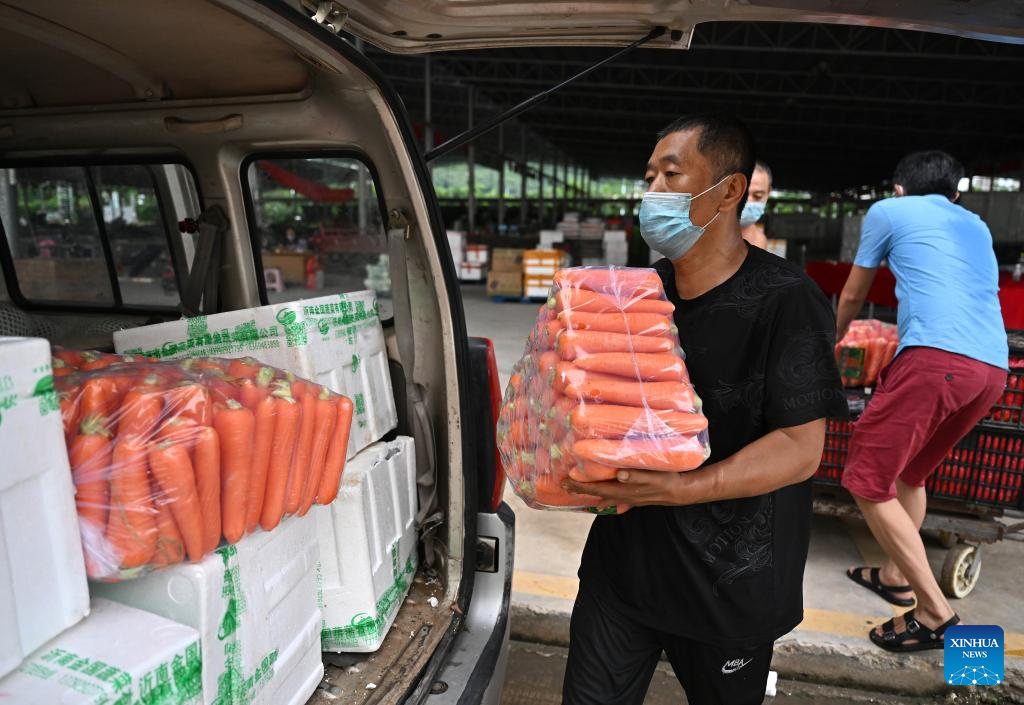 Staff members load vegetables to a vehicle at an agricultural wholesale market in Sanya, south China's Hainan Province, Aug. 8, 2022. Task forces have been established to work around the clock to ensure daily life supplies for local residents and stranded tourists in an effort to fight against the new resurgence of COVID-19 in the city. (Xinhua/Guo Cheng)