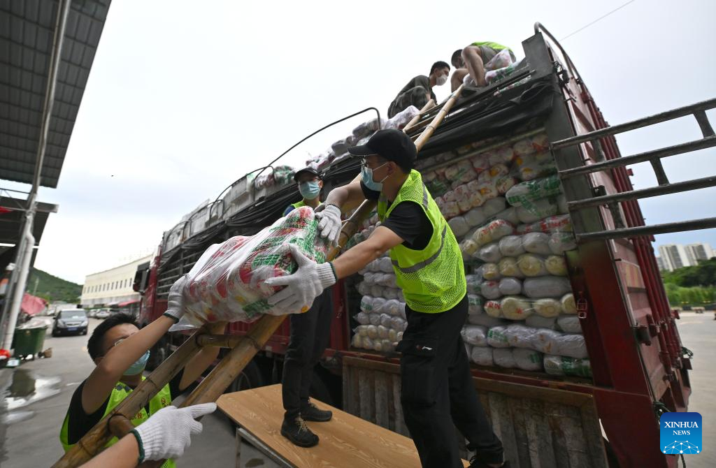 Staff members unload vegetables in Sanya, south China's Hainan Province, Aug. 8, 2022. Task forces have been established to work around the clock to ensure daily life supplies for local residents and stranded tourists in an effort to fight against the new resurgence of COVID-19 in the city. (Xinhua/Guo Cheng)
