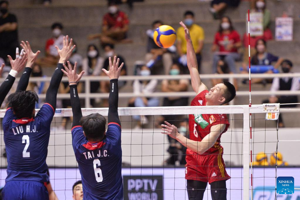 Yu Yuantai (R) of China competes during a 2022 AVC (Asian Volleyball Confederation) Cup match between China and Chinese Taipei in Nakhon Pathom, Thailand, on Aug. 8, 2022. (Xinhua/Rachen Sageamsak)