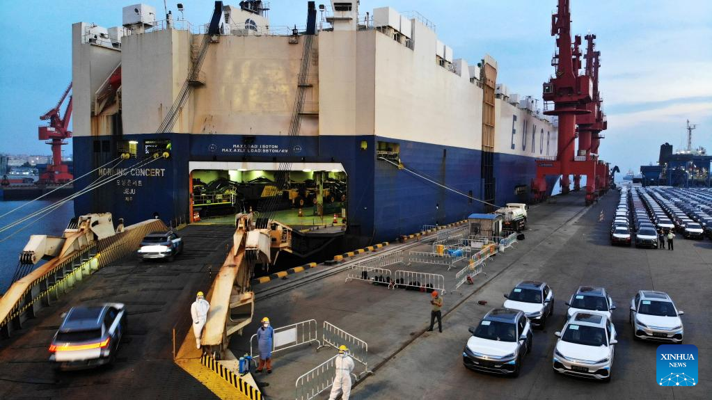 Staff work during the shipment of commercial vehicles onto a ro-ro cargo vessel to depart for Africa at Qingdao Port in Qingdao, east China's Shandong Province, Aug. 7, 2022. By far this year, the export volume of commercial vehicles from Qingdao Port has grown over 90 percent on year-on-year basis. (Xinhua/Li Ziheng)