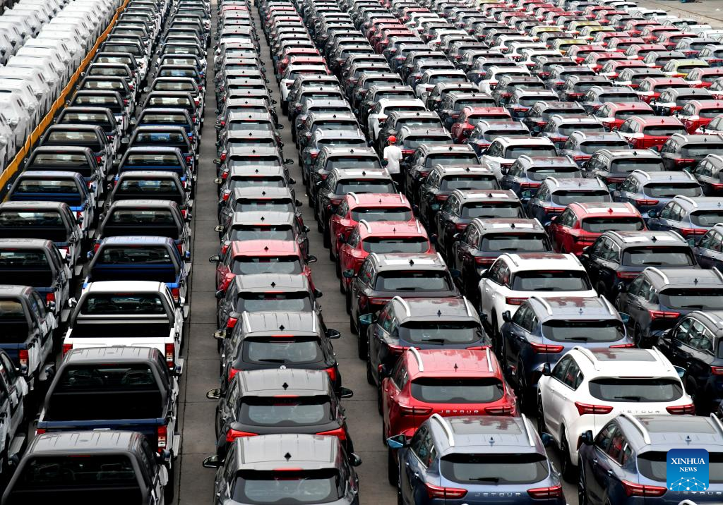 Aerial photo taken on Aug. 7, 2022 shows commercial vehicles before their shipment onto a ro-ro cargo vessel to depart for Africa at Qingdao Port in Qingdao, east China's Shandong Province. By far this year, the export volume of commercial vehicles from Qingdao Port has grown over 90 percent on year-on-year basis. (Xinhua/Li Ziheng)