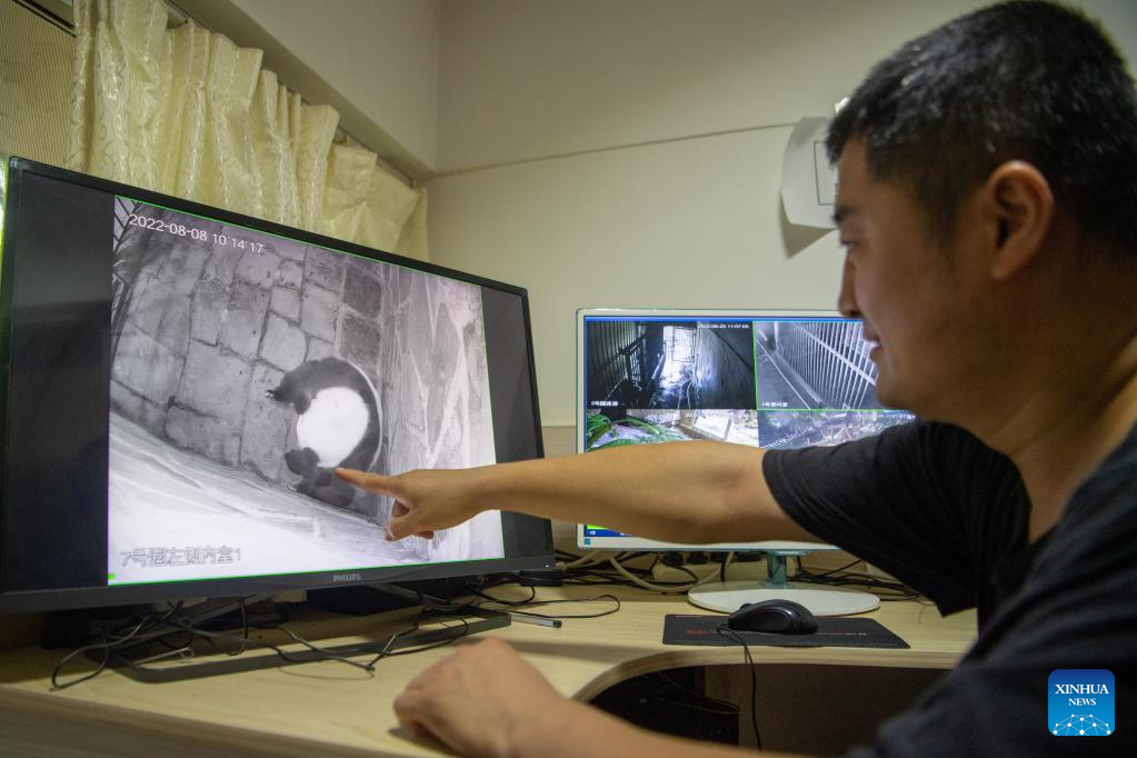 A staff member observes giant panda Er Shun through a monitoring camera at Chongqing Zoo in southwest China's Chongqing Municipality, Aug. 8, 2022. Giant panda Er Shun, born in 2007, returned to China in November of 2020 after staying in the Toronto Zoo and the Calgary Zoo in Canada since March of 2013. Er Shun gave birth to a pair of twin brothers on July 22, 2022 at the Chongqing Zoo after she had succeeded in natural mating with male panda Qing Qing in the China Conservation and Research Center for the Giant Panda in March this year. The panda twin brothers made their debut at the zoo Monday. (Xinhua/Tang Yi)