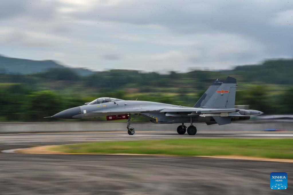 A warplane of the Eastern Theater Command of the Chinese People's Liberation Army (PLA) takes off during joint combat training exercises around the Taiwan Island, Aug 7, 2022. [Photo/Xinhua]