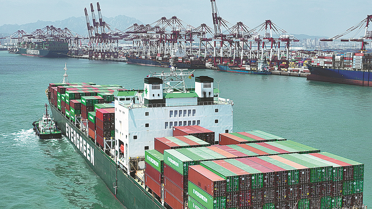 A container ship sails into the Qingdao Port on June 2, 2022. [Photo/Xinhua]