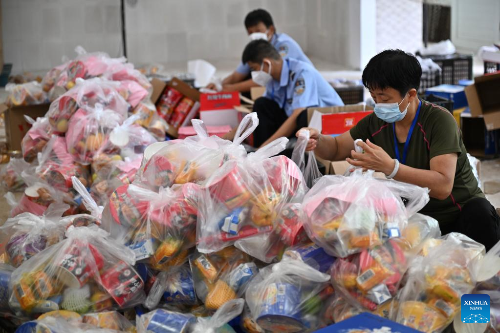 Staff members pack daily life supplies at a warehouse before delivery to local hotels where stranded tourists stay, in Sanya, south China's Hainan Province, Aug. 8, 2022. Task forces have been established to work around the clock to ensure daily life supplies for local residents and stranded tourists in an effort to fight against the new resurgence of COVID-19 in the city. (Xinhua/Guo Cheng)