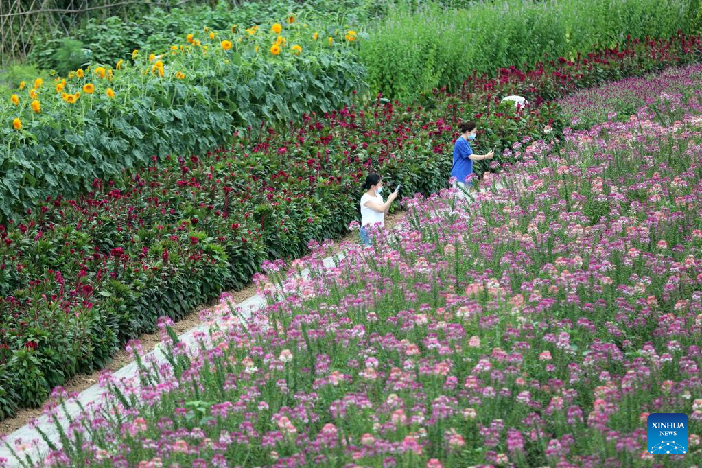 Visitors tour a scenic area themed Chinese medicine and flowers planting in Luanping County of Chengde, north China's Hebei Province, Aug. 8, 2022. In recent years, local authorities of Luanping have striven to upgrade its construction of tourism infrastructure in innovative ways, thus powering its tourism development. (Xinhua/Luo Xuefeng)